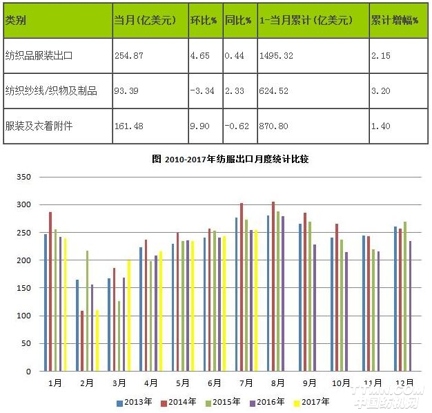根據(jù)海關(guān)總署數(shù)據(jù),2017年1-7月份我國紡織品服裝累計出口1495.32億美元,同比增長2.15%。其中,紡織品出口624.52億美元,同比增長3.20%,服裝及其附件出口870.80億美元,同比增長1.40%。連續(xù)5個月出口呈現(xiàn)穩(wěn)步回暖的積極態(tài)勢。全年紡織服裝出口一舉扭轉(zhuǎn)連續(xù)兩年萎縮頹勢已成定局。