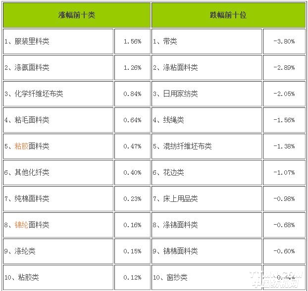 近期,中國(guó)輕紡城市場(chǎng)營(yíng)銷(xiāo)環(huán)比回落,其中:原料市場(chǎng)行情微勢(shì)回升,坯布市場(chǎng)價(jià)量微幅下跌,服裝面料市場(chǎng)布匹價(jià)量小幅下跌,家紡類(lèi)面料成交價(jià)量小幅回落,輔料行情微幅下跌。