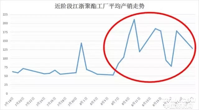 自8月9日FDY聯(lián)盟會議召開后,下游市場采購熱情突然被激發(fā),第二天產(chǎn)銷就突破200%以上,個別廠家甚至出現(xiàn)封盤惜售。此后,滌綸長絲市場火熱勢頭一發(fā)不可收拾,各產(chǎn)品價格重心接連攀升,產(chǎn)銷放量。屈指算來,主流聚酯工廠的產(chǎn)銷破百已超十天。