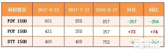 在期貨面提振等因素帶動下,近日來,上游聚酯原料PTA以及乙二醇價格重心多有拉漲,上游成本面節(jié)節(jié)攀升,對于滌綸長絲各產(chǎn)品的盈利空間自然是產(chǎn)生壓縮。近階段以來,聚酯廠家利潤出現(xiàn)縮水,相對僅有POY表現(xiàn)尚可,尤其是FDY盈利同比以及環(huán)比均有一定程度的收縮。