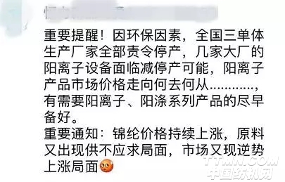 另外提醒:因環(huán)保因素,全國三單體生產(chǎn)廠家全部責令停產(chǎn),幾家大廠的陽離子設備面臨減停產(chǎn)可能,陽離子產(chǎn)品價格走向何去何從……