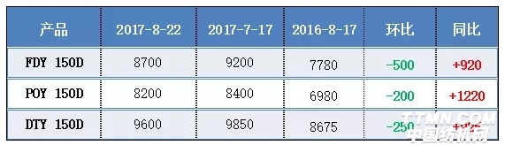 從下圖不難看出,雖然環(huán)比數(shù)據(jù)略有回落,但同比而言,滌綸長絲各產(chǎn)品價格仍處于利好狀態(tài),尤其是POY同比價格上漲超千元,漲幅高達17.5%左右;FDY以及DTY產(chǎn)品價格重心同比漲幅也超10%。