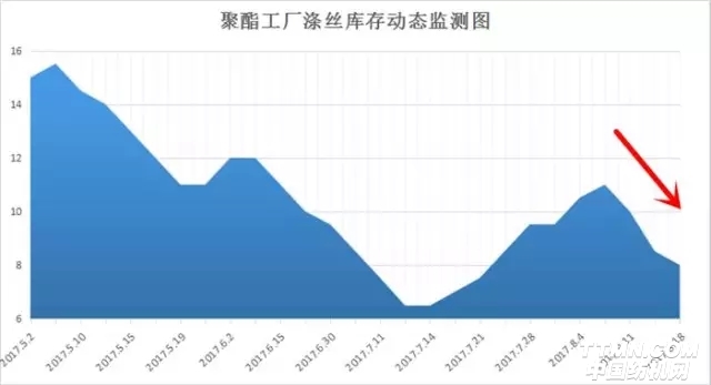 滌綸長絲市場產(chǎn)銷連續(xù)十多天破百,自然帶動聚酯廠家?guī)齑嫠浇抵涟踩牡臀?。?jù)中國綢都網(wǎng)數(shù)據(jù)統(tǒng)計,目前滌絲市場整體庫存在5-16天附近;其中FDY庫存集中在3-9天水平,POY庫存圍繞在4-7天左右,而DTY庫存則調(diào)整至15-24天附近。