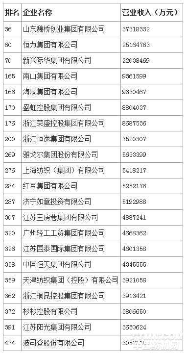 2017中國企業(yè)500強(qiáng)榜單(紡織行業(yè))