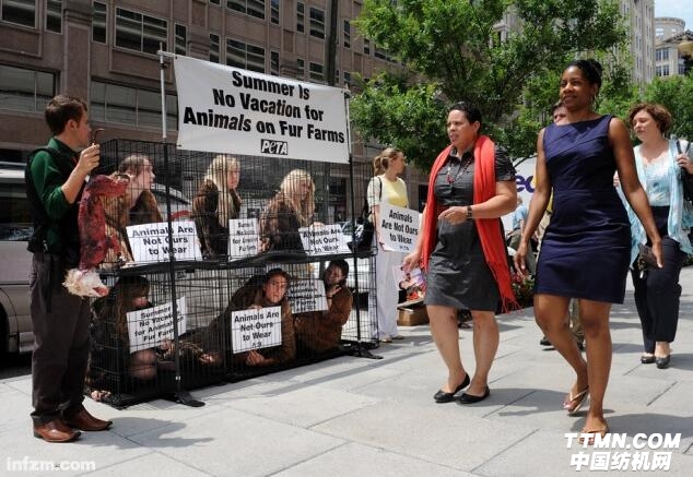 有動物保護主義者穿上染上鮮紅顏料的動物裝,扮成“被剝皮”的動物在服裝店前抗議;將數(shù)萬根鋼針插進動物模型做成雕塑,以警示其所遭受的“剝皮拔毛”之苦。