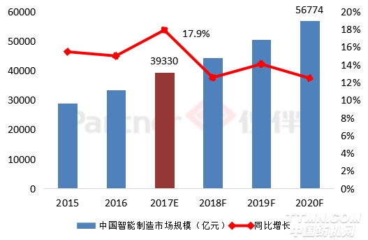 伙伴產(chǎn)業(yè)研究院( PAISI )根據(jù)最新統(tǒng)計數(shù)據(jù)預計,2017 年中國智能制造產(chǎn)業(yè)市場規(guī)模將達到 39330 億元,同比增長17.9%,在全球智能制造總產(chǎn)值中所占的比例為 45% 。