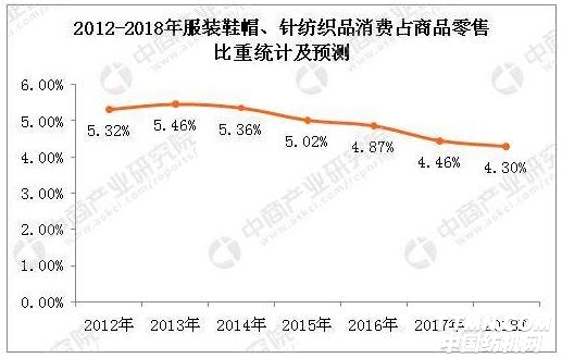 2017年我國商品消費總額為326618億元,同比增長10.2%。經(jīng)統(tǒng)計整理,2017年服裝鞋帽、針紡織品消費占商品零售比重為4.46%。與2016年4.87%的比重相比有所下滑,照此發(fā)展,預(yù)計2018年服裝鞋帽、針紡織品在商品零售中占比會進一步降至4.3%。