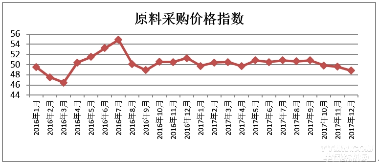 12月原料采購(gòu)價(jià)格指數(shù)48.83,較11月下降0.75。分析原因有如下幾方面;其一,國(guó)際棉花價(jià)格上漲幅度較大。該月受美棉出口簽約增加,以及美國(guó)國(guó)會(huì)通過特朗普總統(tǒng)減稅政策刺激全球股市和油價(jià)大漲,市場(chǎng)對(duì)棉花需求前景樂觀情緒急速升溫,正在蓋過全球棉花豐產(chǎn)的現(xiàn)實(shí),直接推動(dòng)國(guó)外棉花價(jià)格的上漲。Cotlook A指數(shù)折合國(guó)際棉花均價(jià)為14208元/噸,較11月折合價(jià)13312元/噸增長(zhǎng)896元/噸,環(huán)比增長(zhǎng)6.73%。其二,國(guó)內(nèi)棉價(jià)穩(wěn)中有降。紡企受制于年底資金壓力、供求關(guān)系,對(duì)棉花補(bǔ)庫(kù)需求不旺盛,市場(chǎng)棉花價(jià)格弱勢(shì)下行。國(guó)內(nèi)3128B級(jí)現(xiàn)貨棉花均價(jià)為15744元/噸,環(huán)比減少1.91%,同比減少0.59%。由以上原因造成12月國(guó)內(nèi)外棉價(jià)差達(dá)1536元/噸,較11月價(jià)差2739元/噸環(huán)比減少43.7%。其三,非棉纖維采購(gòu)氣氛依舊偏淡。粘膠短纖行業(yè)負(fù)荷維持高位,價(jià)格延續(xù)弱勢(shì);滌綸短纖下游用戶多維持觀望,采購(gòu)較為謹(jǐn)慎。12月,主流粘膠纖維均價(jià)為14311元/噸,環(huán)比降低3.11%,同比降低9.25%。1.4D直紡滌短均價(jià)為8846元/噸,環(huán)比降低2.82%,同比增加7.89%。從2018年1月份中上旬來看,外棉價(jià)格依舊堅(jiān)挺、居高不下;國(guó)內(nèi)棉花市場(chǎng)價(jià)格持穩(wěn)續(xù)跌;粘膠短纖行情表現(xiàn)良好,價(jià)格微漲;滌綸短纖市場(chǎng)整體維持平穩(wěn),看漲但并不激進(jìn)。多數(shù)紡企計(jì)劃年后根據(jù)需求再補(bǔ)充原料庫(kù)存,預(yù)計(jì)2018年1月原料采購(gòu)價(jià)格指數(shù)略有下降。