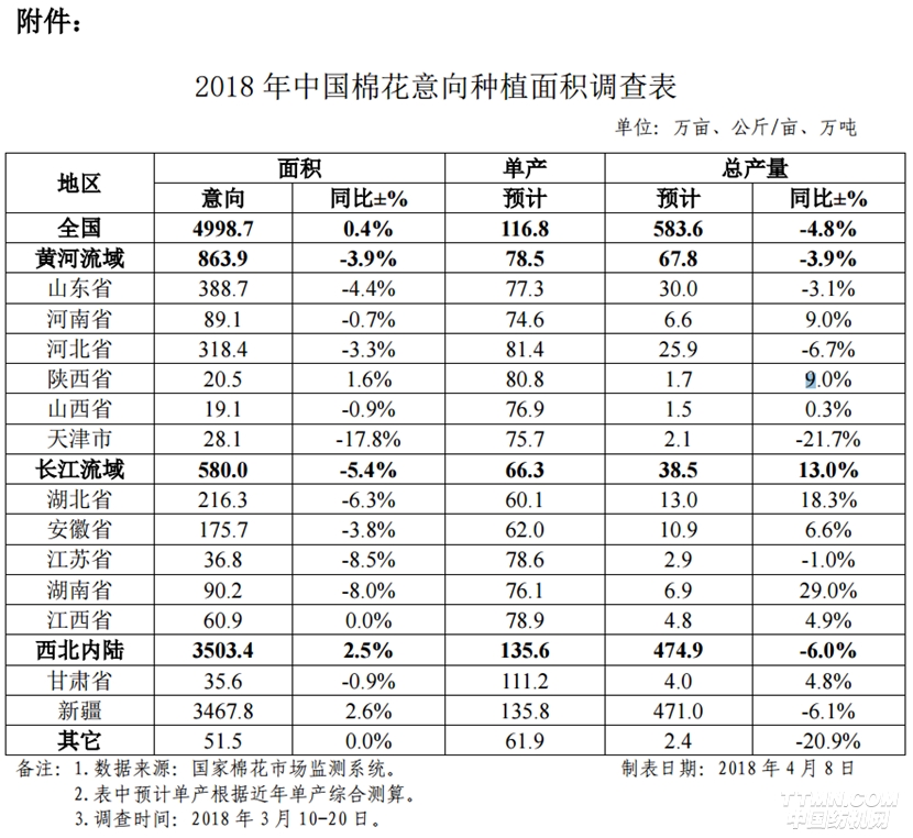 4月12日,國家棉花市場監(jiān)測系統(tǒng)發(fā)布了《2018年中國棉花意向種植面積調查報告(2018年4月)》,調查結果顯示,2018年中國棉花意向種植面積4998.7萬畝,同比增加17.9萬畝,增幅0.4%。
