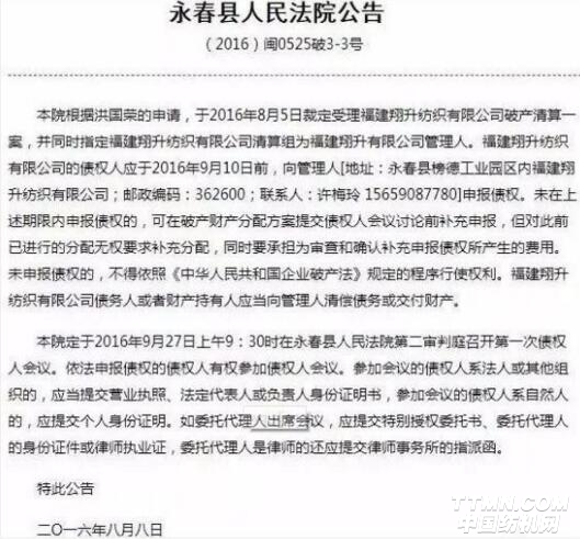 然而,好景不長(zhǎng),據(jù)永春縣人民法院發(fā)出的公告顯示,該紡企已于2016年破產(chǎn)。