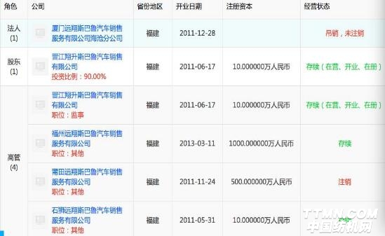 而施養(yǎng)市把多數(shù)汽車銷售公司都放在兒子名下。天眼查顯示,2014年10月27日,施華霖退出福州遠(yuǎn)翔斯巴魯公司法人,12月24日退出石獅遠(yuǎn)翔斯巴魯公司法人,12月30日放棄莆田遠(yuǎn)翔斯巴魯公司法人。兩個(gè)月內(nèi)賣了三家公司,而沒有賣身的廈門分公司也被注銷。