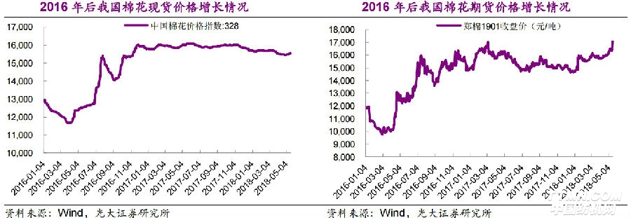 光大證券指出,2018年以來鄭棉期貨價(jià)格持續(xù)上漲,5月鄭棉價(jià)格進(jìn)一步走強(qiáng),5月16日鄭棉1901品種收盤價(jià)17050元,當(dāng)日上漲4.03%、較年初低點(diǎn)(14445元)上漲13.57%,且持倉和成交量顯著放大,期貨市場對棉花漲價(jià)預(yù)期逐漸升溫。