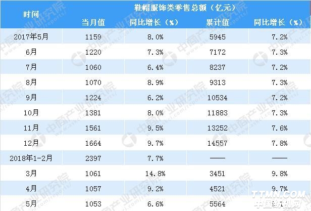 在飲料零售方面,2018年5月份服飾鞋帽類(lèi)零售總額達(dá)1053億元,與去年同期增長(zhǎng)6.6%。2018年1-5月全國(guó)服飾鞋帽類(lèi)零售總額達(dá)5564億元,與去年同期增長(zhǎng)9.1%。