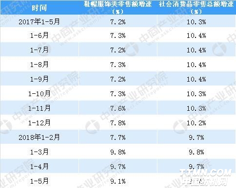 2017-2018年中國(guó)服飾鞋帽類(lèi)零售額與社會(huì)消費(fèi)品零售總額增速情況