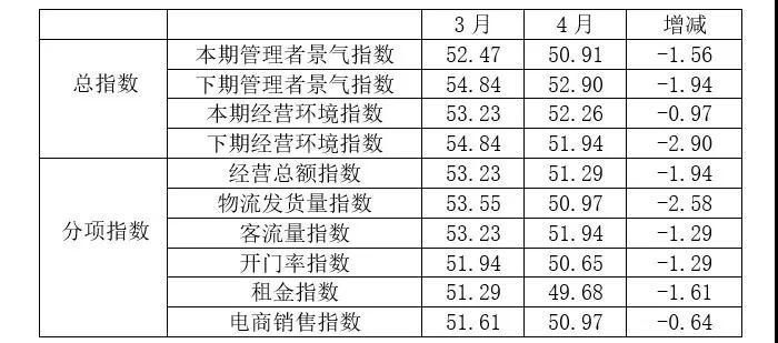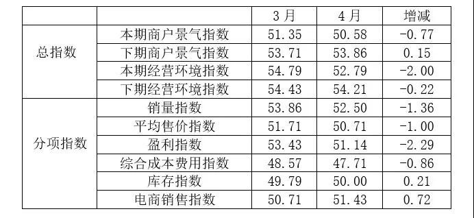 從商戶景氣指數(shù)來看,總指數(shù)中,商戶景氣指數(shù)為50.58,比3月的51.35下降0.77個(gè)百分點(diǎn);經(jīng)營環(huán)境景氣指數(shù)為52.79,比3月的54.79下降2.00個(gè)百分點(diǎn)。