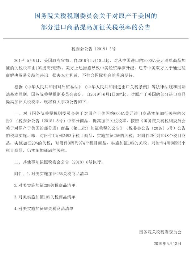此前,美國政府宣布,自2019年5月10日起,對從中國進口的2000億美元清單商品加征的關(guān)稅稅率由10%提高到25%。作為回?fù)?,國?wù)院關(guān)稅稅則委員會決定,自2019年6月1日0時起,對原產(chǎn)于美國的部分進口商品提高加征關(guān)稅稅率。
