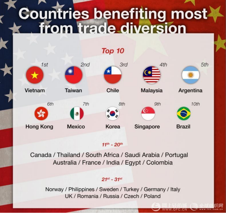 野村表示,除越南外,中美貿(mào)易戰(zhàn)的其他主要受益者是臺(tái)灣,智利,馬來西亞和阿根廷。越南和臺(tái)灣主要受益于對(duì)美國的額外出口,而智利和馬來西亞則通過向中國出口更多商品而受益。