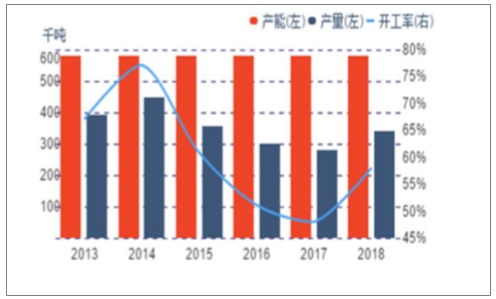 經(jīng)過多年持續(xù)的產(chǎn)能擴張,中國染料行業(yè)已發(fā)展為全球第一,但總體而言,生產(chǎn)以中低端常規(guī)產(chǎn)品為主,大部分中低端產(chǎn)品存在顯著的產(chǎn)能過剩,近年來隨著環(huán)保標準的提升,大量中小企業(yè)產(chǎn)能被迫停產(chǎn)整頓,染料總產(chǎn)能停止增長,行業(yè)開工率處于低位。