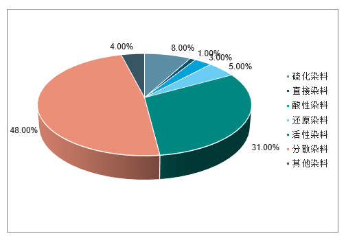 我國生產(chǎn)的主要染料包括分散染料、活性染料、硫化染料、酸性染料、直接染料、還原染料等。我國染料構成中,分散染料和活性染料在幾類染料中產(chǎn)量和出口最大,上述兩類產(chǎn)量約占染料總產(chǎn)量的79%。