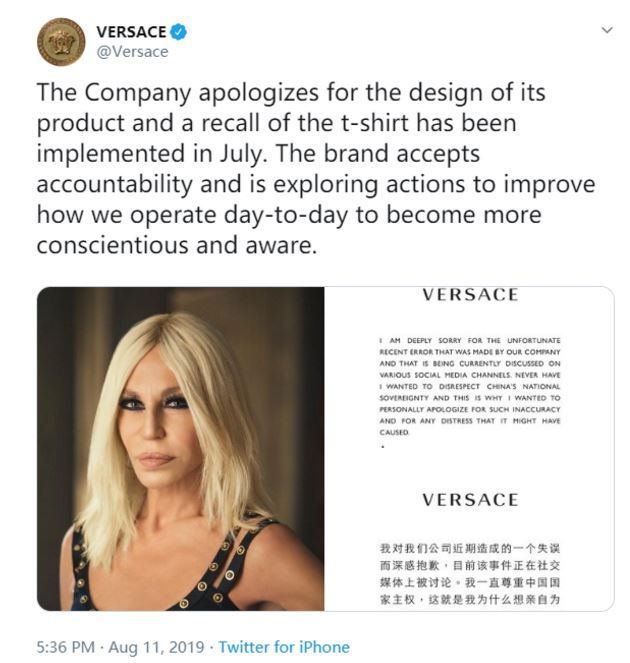 在輿論的壓力下,奢侈品牌范思哲(Versace)于11日凌晨在微博上道歉。