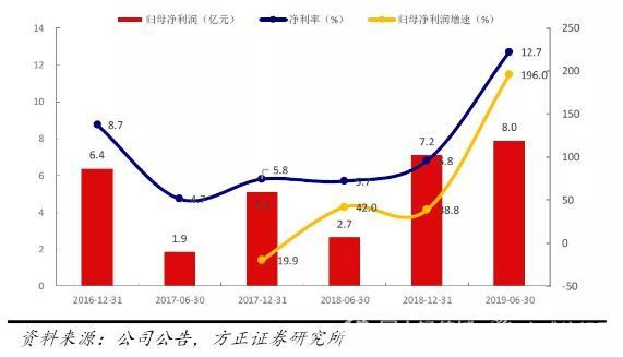 2019年8月14日,公司發(fā)布中期業(yè)績公告,2019H1公司營收同比增長33%至62.55億元,歸母凈利潤同比增長196%至7.95億元。業(yè)績超市場預期。