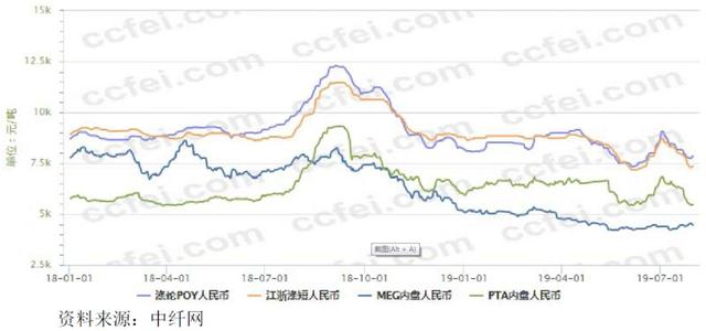 以滌綸為例,市場在經(jīng)過去年四季度的大幅下跌之后,有反彈的意愿,同時國際原油價格上漲形成成本端的支撐,1~4月,市場小幅走高,但無奈需求低迷,5月中美貿(mào)易戰(zhàn)壓力加大導(dǎo)致化纖市場各類產(chǎn)品價格快速下跌,恒力煉化項目投產(chǎn)加大了滌綸下跌的深度。6月價格降至低位,下游逢低買入促使市場成功觸底,隨著G20會議后貿(mào)易戰(zhàn)重新緩和,形成一波短期的上漲行情。但需求并沒有實質(zhì)性的好轉(zhuǎn),7月,價格又回歸基本面進入下跌通道。