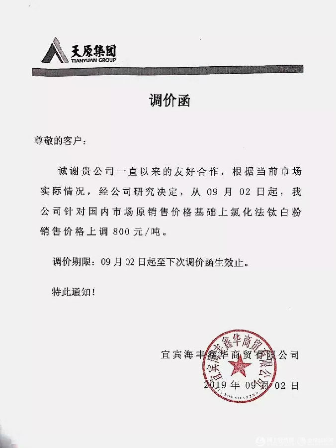 宜賓海豐鑫華商貿(mào)有限公司(以下簡稱“海豐鑫華”)發(fā)布調(diào)價(jià)函稱,根據(jù)當(dāng)前市場實(shí)際情況,經(jīng)研究決定,自9月2日起,針對國內(nèi)市場原銷售價(jià)格基礎(chǔ)上氯化法鈦白粉銷售價(jià)格上調(diào)800元/噸。