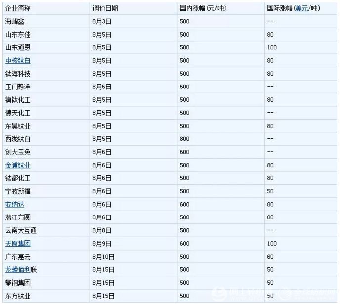 此前在8月8日,海豐鑫華就發(fā)布過調(diào)價(jià)函,稱自8月9日起,其在原銷售價(jià)格基礎(chǔ)上氯化法鈦白粉銷售價(jià)格上調(diào)600元/噸,國外市場上調(diào)100美元/噸。