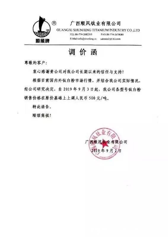 廣西順風(fēng)鈦業(yè)有限公司(簡稱“順風(fēng)鈦業(yè)”)于9月2日發(fā)布的調(diào)價(jià)函內(nèi)容顯示,基于當(dāng)前的市場行情,并結(jié)合該公司的實(shí)際情況,經(jīng)研究決定,從9月3日起,順風(fēng)鈦業(yè)各型號鈦白粉銷售價(jià)格在原價(jià)基礎(chǔ)上上調(diào)人民幣500元/噸。