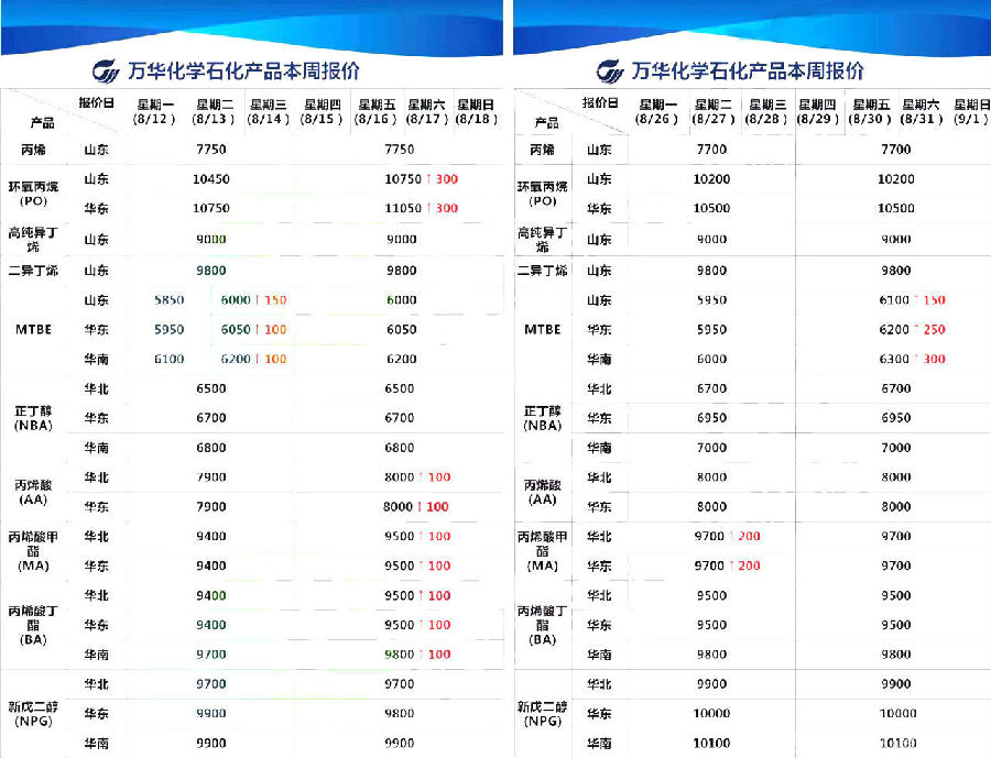 以國內(nèi)化工巨頭萬華化學(xué)為例,近1個月內(nèi),萬華MTBE報(bào)價(jià)上漲兩次,分別為:
