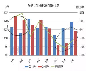 2019年是國內(nèi)PX瘋狂擴(kuò)能的元年,4季度主要關(guān)注浙江石化400萬噸/年P(guān)X裝置的具體投產(chǎn)日期。若4季度海南煉化及浙江石化共計500萬噸/年P(guān)X裝置正常運行,則PX進(jìn)口量進(jìn)一步下降,按照兩套裝置70%-80%的開工負(fù)荷估算,國內(nèi)將增加29-33萬噸/月PX產(chǎn)量。