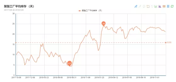 根據(jù)中國綢都網(wǎng)數(shù)據(jù)監(jiān)測顯示,目前聚酯工廠的平均庫存在21天上下,已經(jīng)接近了去年的最高庫存。
