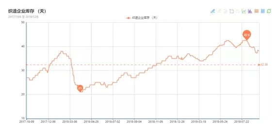 對今年的織造企業(yè)來說,最大的問題應(yīng)該就是坯布庫存太高,資金全部都壓在布上,拿不出足夠的錢來囤貨。根據(jù)中國綢都網(wǎng)數(shù)據(jù)監(jiān)測顯示,現(xiàn)在織造企業(yè)的坯布庫存達到38天左右,且臨近年底,坯布庫存還在不斷累加中。