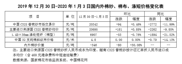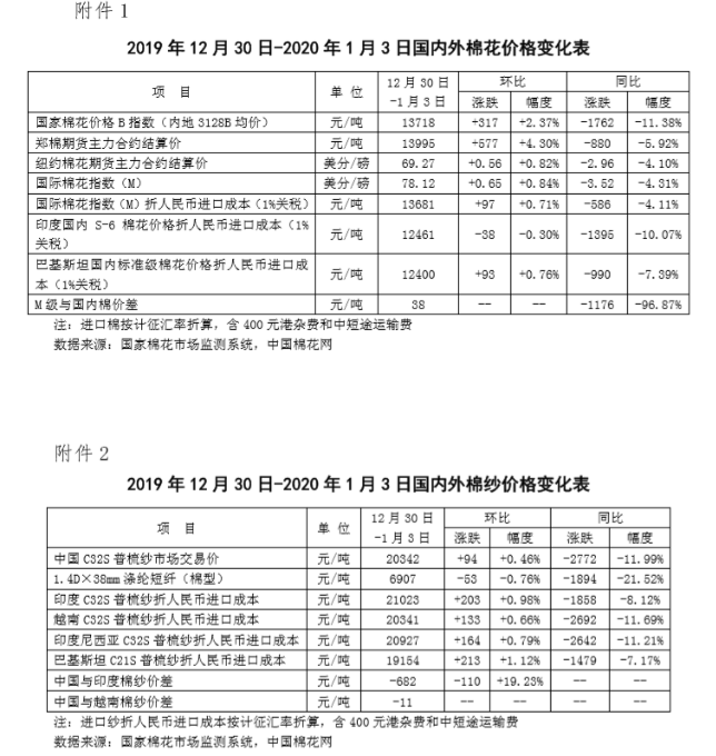 本周,周初中美經(jīng)貿(mào)磋商跟進(jìn)消息繼續(xù)增強(qiáng)市場(chǎng)預(yù)期,中國(guó)央行宣布下調(diào)金融機(jī)構(gòu)存款準(zhǔn)備金率0.5個(gè)百分點(diǎn),周末國(guó)際局勢(shì)惡化,棉花市場(chǎng)整體上漲。2019年12月30日-2020年1月3日代表內(nèi)地標(biāo)準(zhǔn)級(jí)皮棉銷售價(jià)格的國(guó)家棉花價(jià)格B指數(shù)均價(jià)13718元/噸,較上周上漲317元/噸,漲幅2.37%;鄭州棉花期貨主力合約結(jié)算均價(jià)13995元/噸,較上周上漲577元/噸,漲幅4.30%。鄭棉期貨先揚(yáng)后抑,現(xiàn)貨周后期漲幅顯著收斂。1月3日鄭棉主力合約結(jié)算價(jià)14035元/噸,比前日下跌35元/噸。12月30及31日、1月2日及3日國(guó)棉現(xiàn)貨價(jià)格較前一日上漲幅度1.58%、0.21%、0.15%、0.19%。