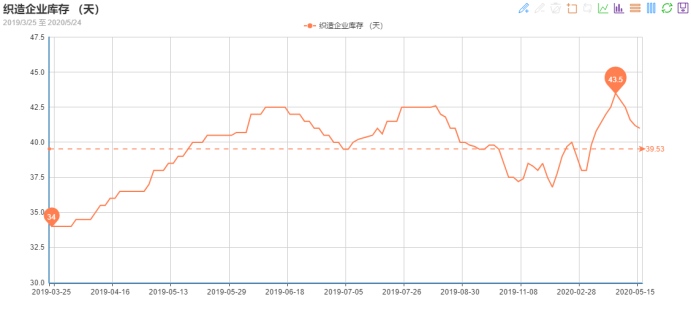 進(jìn)入五月,市場(chǎng)行情稍有回暖,走貨較前期也有好轉(zhuǎn)。據(jù)中國(guó)綢都網(wǎng)統(tǒng)計(jì)數(shù)據(jù)來(lái)看,目前江浙地區(qū)坯布庫(kù)存較前期有所下降,現(xiàn)在坯布庫(kù)存集中在41天左右。