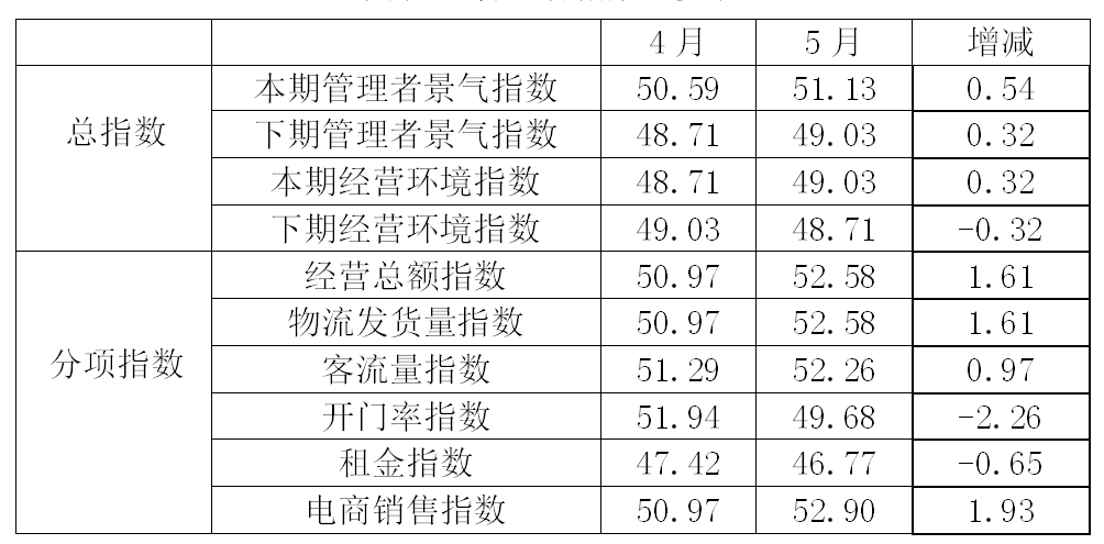 從商戶景氣指數(shù)來看,總指數(shù)中,5月商戶景氣指數(shù)為50.13,比4月的48.92上升1.21個百分點;經營環(huán)境指數(shù)為48.83,比4月的47.55上升1.28個百分點。
