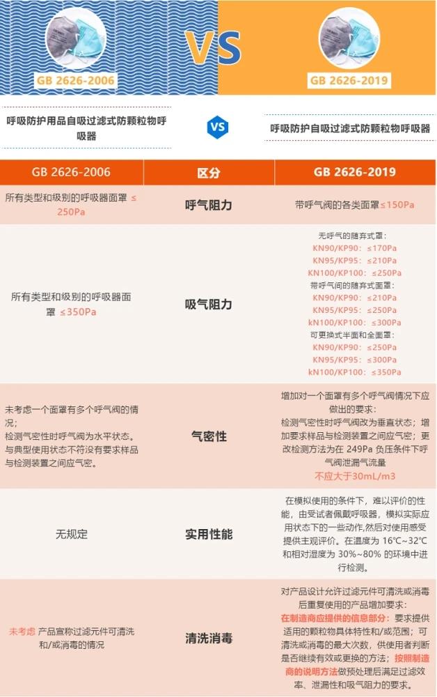 相對于2006版,在遵循科學(xué)性、規(guī)范性、協(xié)調(diào)性、時效性等基本原則的基礎(chǔ)上,根據(jù)科學(xué)進(jìn)步和產(chǎn)品發(fā)展的趨勢,在不降低防護(hù)能力的前提下調(diào)整呼吸阻力指標(biāo),完善檢測方法,優(yōu)化半口罩的下方視野,提高產(chǎn)品的舒適性。