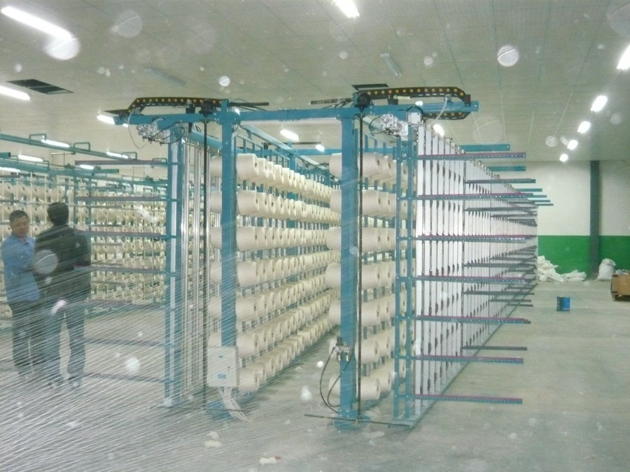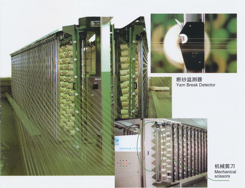 1.本主機整體安裝于地軌上,由高精度伺服電機驅(qū)動主機左右移動。倒軸有固定式和移動式兩種,分絞筘架及筒子架為固定形式。在整個分條整經(jīng)過程中所有條帶從開始至整經(jīng)結(jié)束其紗線位置始終處于原點的直線位置,由于采用自動放倒裝置,片紗張力在倒軸過程中停車時張力保持不變。