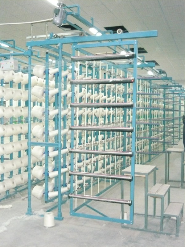 12.筒子架:筒子架形式有矩型筒子架、小V型筒子架。兩種形式筒子架插筒子的轉(zhuǎn)框安裝形式有固定式、回轉(zhuǎn)式兩種。固定式轉(zhuǎn)框是一側(cè)插筒子;轉(zhuǎn)框式是二側(cè)插筒子,一側(cè)筒子工作是,另一側(cè)可插入預備筒子,一側(cè)筒子工作結(jié)束后,轉(zhuǎn)框回轉(zhuǎn)180,預備紗錠將紗線引出即可工作,提高了整經(jīng)機的有效工作時間。筒子架的轉(zhuǎn)框是回轉(zhuǎn)式(二面插筒子),張力機構(gòu)的張力片是順出紗方向出紗張力。張力需調(diào)整時,即可調(diào)整張力器的包圍角來改變張力。