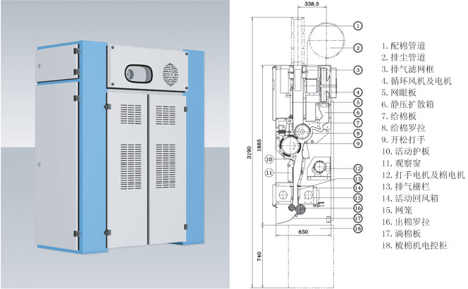 用途:本機(jī)是國內(nèi)最先進(jìn)的喂棉機(jī)構(gòu),置于開松機(jī)后面,借輸棉風(fēng)機(jī)的作用,將充分開松的纖維均勻填充到本機(jī)上棉箱,再經(jīng)過一對(duì)羅拉及打手作用,以及循環(huán)風(fēng)機(jī)吹風(fēng)作用,在下棉箱產(chǎn)生均勻筵棉,再由一對(duì)軋輥輸出,供梳理機(jī)使用。 主要特征:本機(jī)采用SCC控制技術(shù)自動(dòng)控制,結(jié)合變頻器達(dá)到連續(xù)均勻喂棉的效果,并可通過下棉箱吸風(fēng)口的風(fēng)門調(diào)節(jié)來調(diào)整橫向均勻度。 |