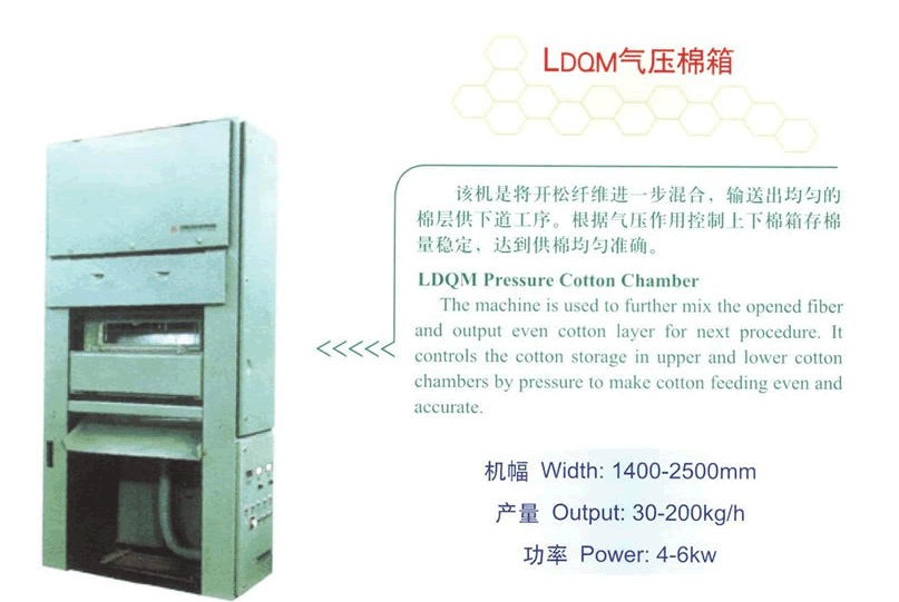 | YYQM氣壓棉箱 用途特點(diǎn):將開(kāi)松纖維進(jìn)一步混合,輸送出均勻的棉層供下道工序。根據(jù)氣壓作用控制上下棉箱存棉量穩(wěn)定,達(dá)到供棉均勻準(zhǔn)確。 主要規(guī)格:機(jī) 幅:1400-2500mm 產(chǎn) 量:30-200kg/h 功 率:4-6kw YYQM Pressure Cotton Chamber Purpose and characteristics: To further mix the opened fiber and output even cotton layer for next procedure. It controls the cotton storage in upper and lower cotton chambers by pressure to make cotton feeding even and accurate. Main specifications: Machine width: 1400-2500mm Output volume: 30-200kg/h Power: 4-6kw |