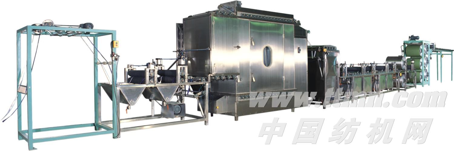 3、本機型為高效率織帶染色機:由放帶裝置->染缸->紅外預熱->高低溫固色->前延伸->后延伸固色箱->密封箱清洗->燙干定型箱->收帶