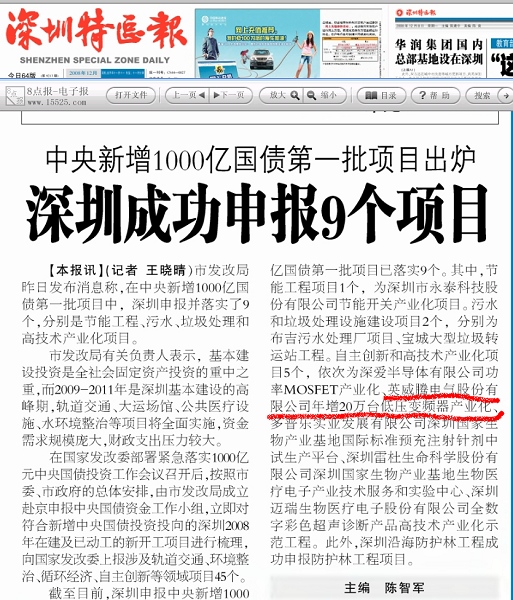 深圳市發(fā)改局7日發(fā)布消息稱,在中央新增1000億國(guó)債第一批項(xiàng)目中,深圳申報(bào)并落實(shí)了9個(gè),深圳市英威騰電氣股份有限公司申報(bào)的自主創(chuàng)新和高技術(shù)產(chǎn)業(yè)化項(xiàng)目《年新增20萬(wàn)臺(tái)低壓變頻器擴(kuò)建項(xiàng)目》也在其列,成為國(guó)內(nèi)唯一獲批專項(xiàng)的低壓變頻器項(xiàng)目。此項(xiàng)目建設(shè)不但可提升我國(guó)變頻器制造業(yè)的技術(shù)水平、提高我國(guó)電力電子器件產(chǎn)業(yè)的綜合競(jìng)爭(zhēng)力和國(guó)際地位,還將通過(guò)電機(jī)節(jié)能緩解國(guó)家能源緊張形勢(shì)、減少二氧化碳等溫室氣體排放,對(duì)提高我國(guó)工業(yè)運(yùn)行質(zhì)量和促進(jìn)技術(shù)進(jìn)步也有積極的作用。同時(shí)該擴(kuò)建項(xiàng)目還將促進(jìn)電力電子器件產(chǎn)業(yè)的發(fā)展,特別是對(duì)上游IGBT、整流橋等模塊生產(chǎn)企業(yè)的成長(zhǎng)有很強(qiáng)的推動(dòng)作用;也將促進(jìn)自動(dòng)化控制、電機(jī)等產(chǎn)業(yè)發(fā)展,帶動(dòng)下游包括煤炭、油氣鉆采、冶金、電力、石化和化工、市政等行業(yè)的技術(shù)進(jìn)步與工藝控制水平的提高,節(jié)能降耗,促進(jìn)整個(gè)工業(yè)產(chǎn)業(yè)鏈的協(xié)調(diào)發(fā)展,提高綜合競(jìng)爭(zhēng)實(shí)力,為國(guó)家節(jié)能降耗和電力電子器件產(chǎn)業(yè)的整體發(fā)展壯大做出貢獻(xiàn)。