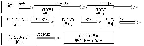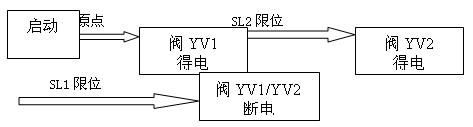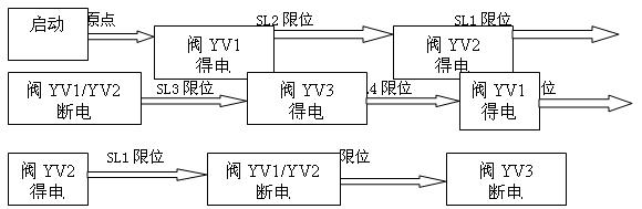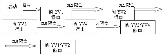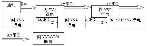 (3)單步工藝流程3描述:開車啟動(dòng),恢復(fù)原點(diǎn),閥YV1得電,下托板前進(jìn)碰到下托板慢進(jìn)限位SL2后閥YV2得電下托板開始慢進(jìn),下托板慢進(jìn)碰到前進(jìn)到位限位SL1后閥上托板前進(jìn)閥YV3得電上托板前進(jìn),上托板前進(jìn)碰到上托板慢進(jìn)SL5限位后,上托板慢進(jìn)閥YV4得電,上托板慢前進(jìn)碰到前進(jìn)到位限位SL4后閥YV1,YV2斷電下托板回退,碰到回退到位限位SL3信號(hào)后上托板前進(jìn)閥YV3,YV4斷電,上托板回位。