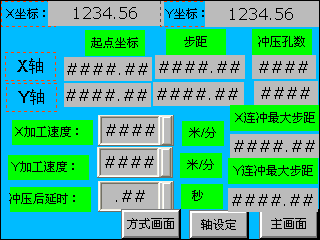 工藝畫面如圖4所示:在工藝畫面可以設(shè)置起點(diǎn)坐標(biāo)、步距、沖壓孔數(shù),最大步距加工速度等,對(duì)于所設(shè)步距大于最大步距時(shí),PLC會(huì)判斷,等待進(jìn)給到位信號(hào)到來后沖頭方可沖下。