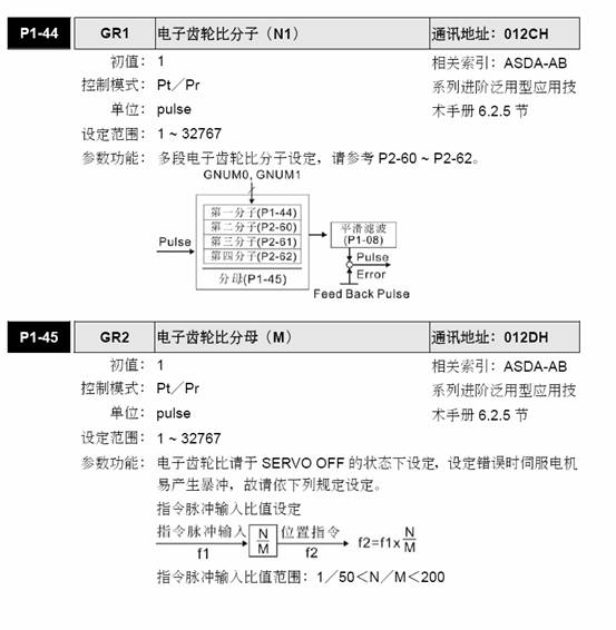(3)電子齒輪比分子:1-44 = 5 ;電子齒輪比分母1-45 = 2 。