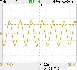 臺達B、V系列均具有高頻輸出的功能,通過其高頻輸出直接來給變壓器供電。從而簡化了臭氧電源電路的設(shè)計,以及其完善的保護措施保證了這個系統(tǒng)的可靠性和穩(wěn)定性。同時由于其完善的控制算法,在高頻輸出時保證了電流的穩(wěn)定。下圖是在變頻器的輸出端無電抗器,變壓器工作在額定頻率之上的電流波形。可以根據(jù)圖形看出,臺達變頻器在負載沖擊比較大的情況下,仍然能夠保證電流的平滑性。