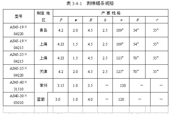 (一)三羅拉剝棉裝置  三羅拉剝棉裝置由剝棉羅拉3和一對(duì)軋(碎)輥4組成,如圖3-4-1所示。剝棉羅拉表面包覆有“山”形鋸條,其主要規(guī)格見表3-4-1!吧健毙武彈l因其工作角為負(fù)角,不能握持纖維,所以工作時(shí)不會(huì)破壞棉網(wǎng)的結(jié)構(gòu)。