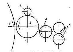 (四)四羅拉剝棉裝置   四羅拉剝棉裝置如圖3-4-2所示.該裝置有一個(gè)較大直經(jīng)的剝棉羅拉3和一個(gè)轉(zhuǎn)移羅拉4、兩個(gè)軋輥5,剝棉羅拉和轉(zhuǎn)移羅拉表面包卷有山形齒,對(duì)纖維的作用相同。四羅拉剝棉裝置的剝?nèi)≡砼c三羅拉相同。剝棉裝置均配置有防返花裝置,因機(jī)型不同而各異。圖中防返花裝置為一兩端裝有限位開關(guān)的絨輥2,由剝棉羅拉傳動(dòng),當(dāng)絨輥因繞花上抬到一定位置時(shí),通過控制桿推動(dòng)限拉開關(guān)使機(jī)器停轉(zhuǎn),以保護(hù)金屬針布,避免扎壞。