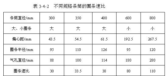 從圖上可知,底盤一轉(zhuǎn),偏心距e轉(zhuǎn)過的孤長(zhǎng)為2πe,即圈條中心繞條筒中心回轉(zhuǎn)1周,圈條斜管轉(zhuǎn)過的圈數(shù)為2πe/d。即圈條速比i=2πe/d。由此可見,當(dāng)棉條直徑一定時(shí),圈條速比隨偏心距e的增加而增大。同時(shí),圈條器速比也與條筒直徑等因素有關(guān)。不同規(guī)格條筒的圈條速比見表3-4-2。